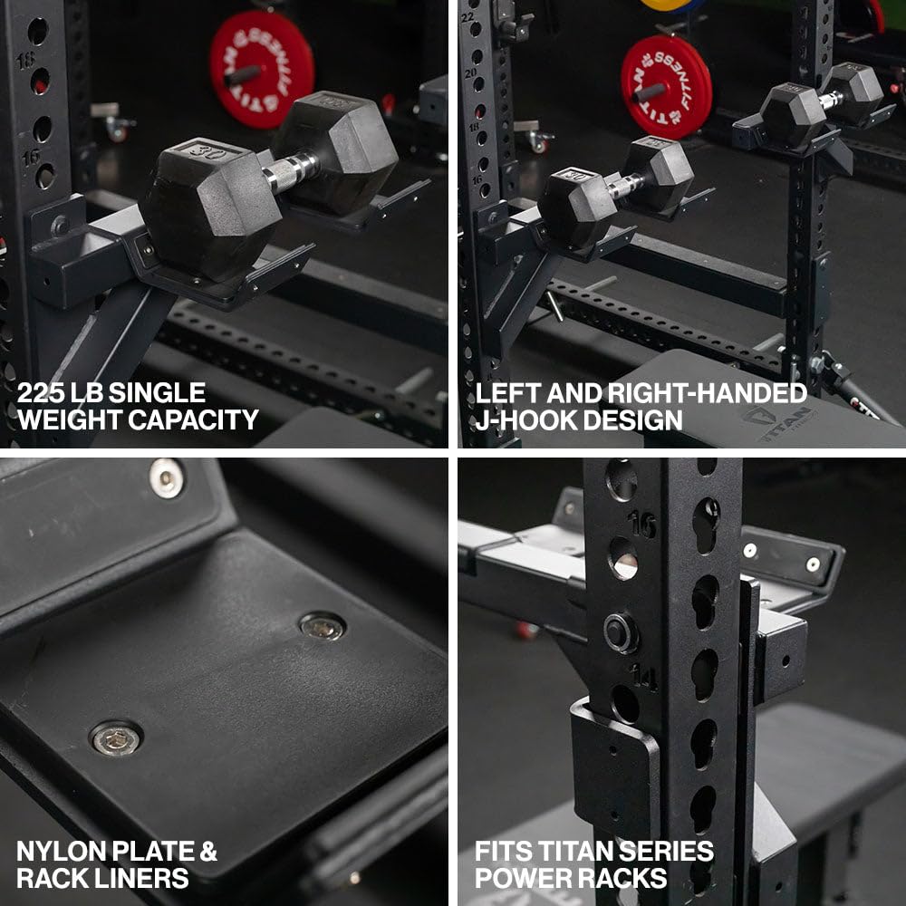 Titan Fitness X-3 & TITAN Series Dumbbell Holders, Rack-Mounted Spotter Arms, 450 LB Capacity, J-Hook Mount, Nylon-Lined, Home Gym & Strength Training Accessory